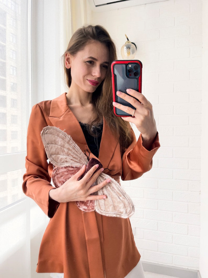 This textile Moth has a wingspan of 41 cm / 16 inches and features rich shades of blush pink and gold silk satin.